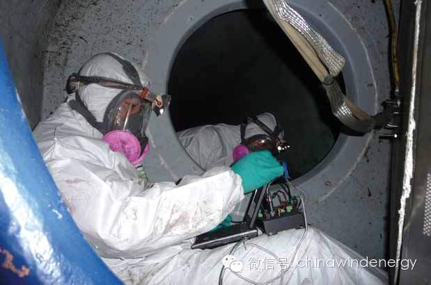 對(duì)風(fēng)電機(jī)組做載荷測(cè)試,要求檢測(cè)人員在塔筒、輪轂、葉片等不同位置裝上貼片,其他位置相對(duì)來(lái)說(shuō)較為容易,但葉片位置的工作在夏天會(huì)很難。首先因?yàn)槿~片中含有大量的玻璃纖維碎屑,人在其中活動(dòng)會(huì)引起碎屑的飄散,如果進(jìn)入肺部,將會(huì)引起嚴(yán)重的肺病,因此必須戴防護(hù)面具。另外因?yàn)檫@些玻璃纖維碎屑的摩擦力很大,而爬進(jìn)葉片前必須通過(guò)滿是油污的輪轂,極易將衣服染色和磨破,所以必須穿著完全隔絕外部的防護(hù)服。因夏天氣溫較高,當(dāng)氣溫在30 度的時(shí)候,輪轂內(nèi)溫度能達(dá)到40 多度,將這樣的防護(hù)工作做好后,人體極易產(chǎn)生高溫反應(yīng)。