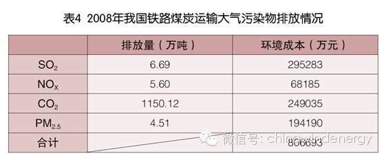 根據(jù)《中華人民共和國鐵道部2008年鐵道統(tǒng)計公報》,2008年全國鐵路貨物發(fā)送量完成329035萬噸,煤炭運量完成169146萬噸,占51.41%。全國鐵路貨物周轉量為23360.32億噸公里,煤炭周轉量為8360.28億噸公里。根據(jù)鐵道部統(tǒng)計中心得出的鐵路運輸大氣污染排放因子,可計算出2008年我國煤炭鐵路運輸?shù)奈廴疚锱欧帕浚Y合前文計算出的大氣污染物環(huán)境成本,可得煤炭鐵路運輸?shù)沫h(huán)境成本,如表4所示。2008年我國火力發(fā)電總量為278573680.4萬千瓦時,由此可計算煤炭鐵路運輸?shù)沫h(huán)境成本Ce(鐵路運輸)=0.0029元/千瓦時。
