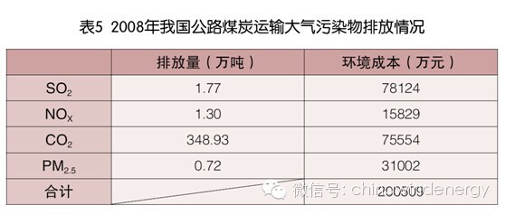 根據(jù)《2009年公路水路交通行業(yè)發(fā)展統(tǒng)計公報》,2008年我國公路貨運平均運距為171.48公里,總周轉量為1664.35億噸公里,水路貨運平均運距為1706.66公里,總周轉量為6952.93億噸公里。結合公路與水路運輸主要排放因子的數(shù)值,可計算出2008年我國煤炭公路運輸?shù)奈廴疚锱欧帕?,由前文計算出的大氣污染物環(huán)境成本,可得煤炭公路運輸?shù)沫h(huán)境成本,如表5所示。2008年我國火力發(fā)電總量為278573680.4萬千瓦時,由此可計算煤炭公路運輸?shù)沫h(huán)境成本Ce(公路運輸)=0.0007元/千瓦時。