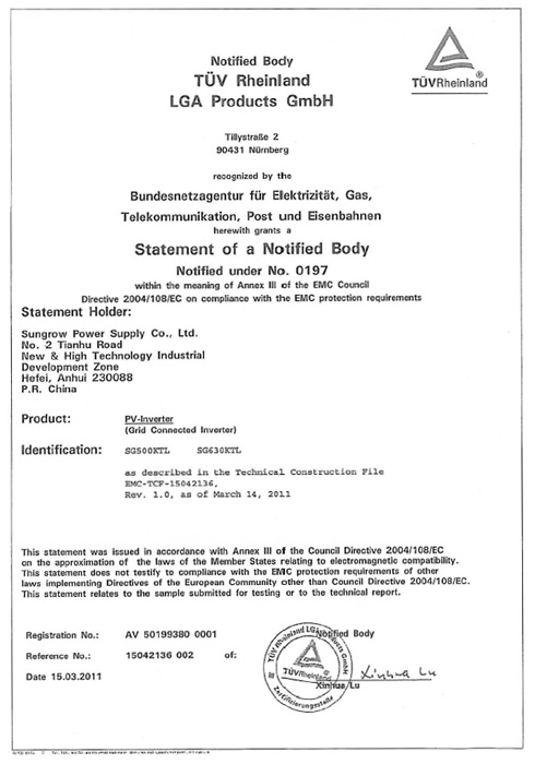系列500kW、630kW大功率光伏逆變器,特別是630kW這一2010年推出的新品,在世博會新品發(fā)會上甫一亮相就受到了行業(yè)專家和海內(nèi)外客戶的一致肯定。為使產(chǎn)品能更好地滿足客戶需求,公司研發(fā)技術(shù)人員對產(chǎn)品精益求精,從性能指標(biāo)的優(yōu)化測試再到各項參數(shù)的嚴(yán)格驗證,并在安全、高低溫運行環(huán)境、電磁兼容及其他性能指標(biāo)的嚴(yán)格測試、檢驗中,一次性順利通過全部安全和EMC測試,完全符合相關(guān)國際標(biāo)準(zhǔn)的嚴(yán)格要求,順利取得TÜV認(rèn)證機構(gòu)頒發(fā)的證書。